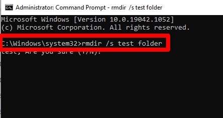 2. Usa il flag / s con rmdir per forzare l’eliminazione della cartella insieme alle sottocartelle e ai file in essa contenuti. Ad esempio, se si desidera rimuovere una cartella denominata “Cartella di test”, immettere la cartella di prova rmdir / s.