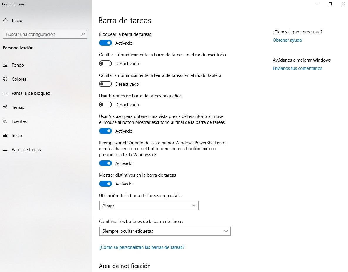 Per quanto riguarda " Barra delle applicazioni ", qui abbiamo ampie opzioni di personalizzazione per Windows 10. Ad esempio, possiamo variare dal bloccare la barra delle applicazioni nel menu di avvio di Windows per nasconderla automaticamente quando siamo in modalità desktop. Inoltre, alcune caselle sono incluse anche nel caso in cui Windows 10 venga utilizzato su un tablet, dal nascondere nuovamente la barra stessa al posizionamento dei pulsanti in un modo più piccolo o persino scegliendo la posizione della barra nel menu di avvio.