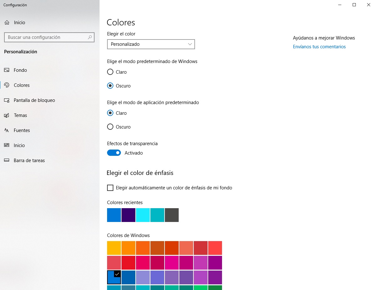 - Scegli la modalità predefinita di Windows : puoi impostare "chiaro" o "scuro", e fondamentalmente ti consente di modificare la barra delle applicazioni e tutto ciò che è il "frame" dell'aspetto di Windows .