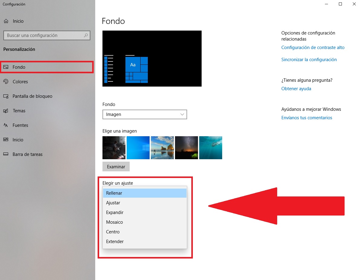 Quando si è chiari su ciò che si desidera impostare come sfondo, nella parte inferiore è possibile selezionare l'impostazione " ". Qual è l'impostazione? Bene, qualcosa di semplice come quello che vuoi che faccia l'immagine nel caso in cui non dia le dimensioni indicate. Puoi riempire lo sfondo, regolarlo ai margini, espanderlo (non consigliato), creare un mosaico, centrare l'immagine o estenderlo (schermo intero non raccomandato).