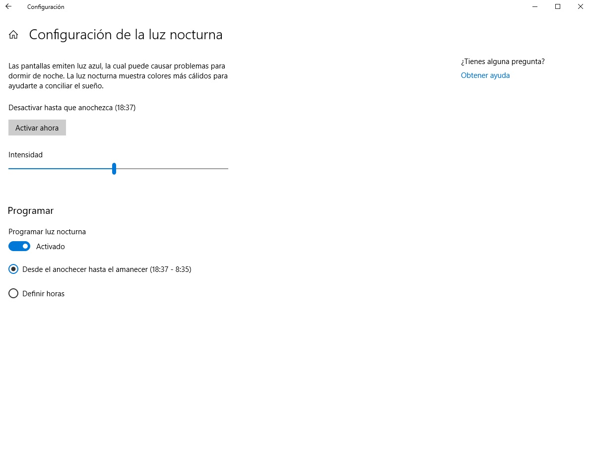 Questa opzione è abbastanza inosservata da molti utenti e pensiamo che sia un genio: la modalità luce notturna (da non confondere con il tema oscuro). Windows 10 all'epoca introduceva un'opzione per la luminosità dello schermo che si attenuava dopo un certo tempo. L'idea, ovviamente, è che gli occhi degli utenti non soffrano della luminosità dello schermo, che è spesso dannosa (specialmente se abbiamo una lunga esposizione ad esso).