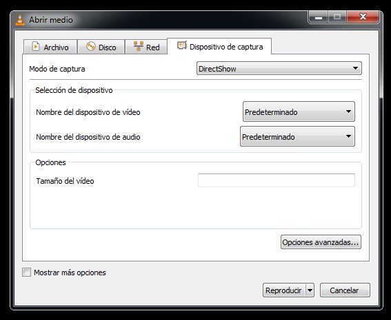 Come ulteriori suggerimenti, in «Audio» ti consigliamo di mettere il tuo microfono nel caso in cui lo possiedi (in caso contrario, quindi l'ingresso della webcam stessa). Allo stesso modo, se fai clic su " Opzioni avanzate " sarai in grado di modificare le caratteristiche del video della tua webcam, come il bitrate di registrazione, la frequenza dei fotogrammi e un lungo eccetera che è comune in questo tipo di situazione . Fai clic su "Riproduci" e la telecamera verrà visualizzata all'interno del visualizzatore VLC. Per finire, fai clic su " Salva " o " Converti " e il file inizierà a generare.