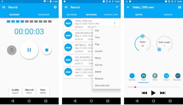 Registratore ed editor audio è una popolare app gratuita per Android da cui non puoi solo registrare tracce audio ma puoi anche modificarle in modo professionale. Oltre a tutto ciò, l’applicazione è orgogliosa di essere l’unica in tutto il catalogo del Play Store in grado di riavvolgere una traccia mentre si è in piena registrazione .