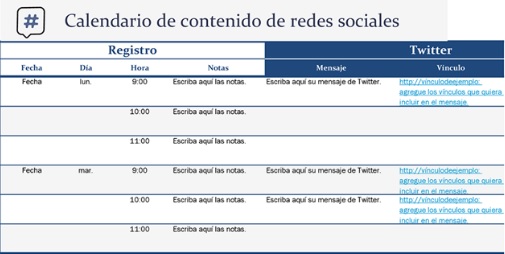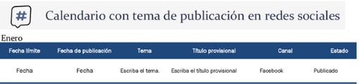 - Calendario dei contenuti sui social network – Struttura in modo chiaro e semplice tutto il contenuto che hai pubblicato o che pubblicherai sui social network. Ciò consente di aggiungere la data e l'ora della pubblicazione nonché un collegamento al social network una volta pubblicato su Internet.