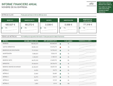 - Rapporto finanziario annuale – Se hai una piccola o grande azienda, sarai sicuramente interessato a informare i risultati della tua attività alla fine di ogni anno. Questo modello è stato progettato per mostrarti in modo semplice e accattivante i dati chiave della tua azienda e le sue prestazioni durante tutto l'anno.