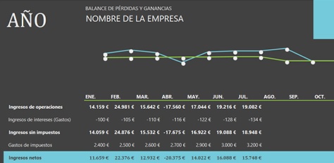 - Profitti e perdite – Tieni sempre presente le entrate e le spese annuali della tua azienda grazie a questo strumento. Oltre ad essere molto semplice da usare, offre anche un grafico con il quale troverai molto facile vedere l'evoluzione della tua attività ogni mese.