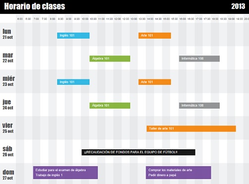 - Piano delle classi (all'ora) – Questo modello è stato progettato per avere una panoramica di tutte le lezioni settimanali e delle consegne future di lavoro, progetti o esami. Il modello include la possibilità di aggiungere compiti a casa durante il fine settimana per aumentare il rendimento scolastico.