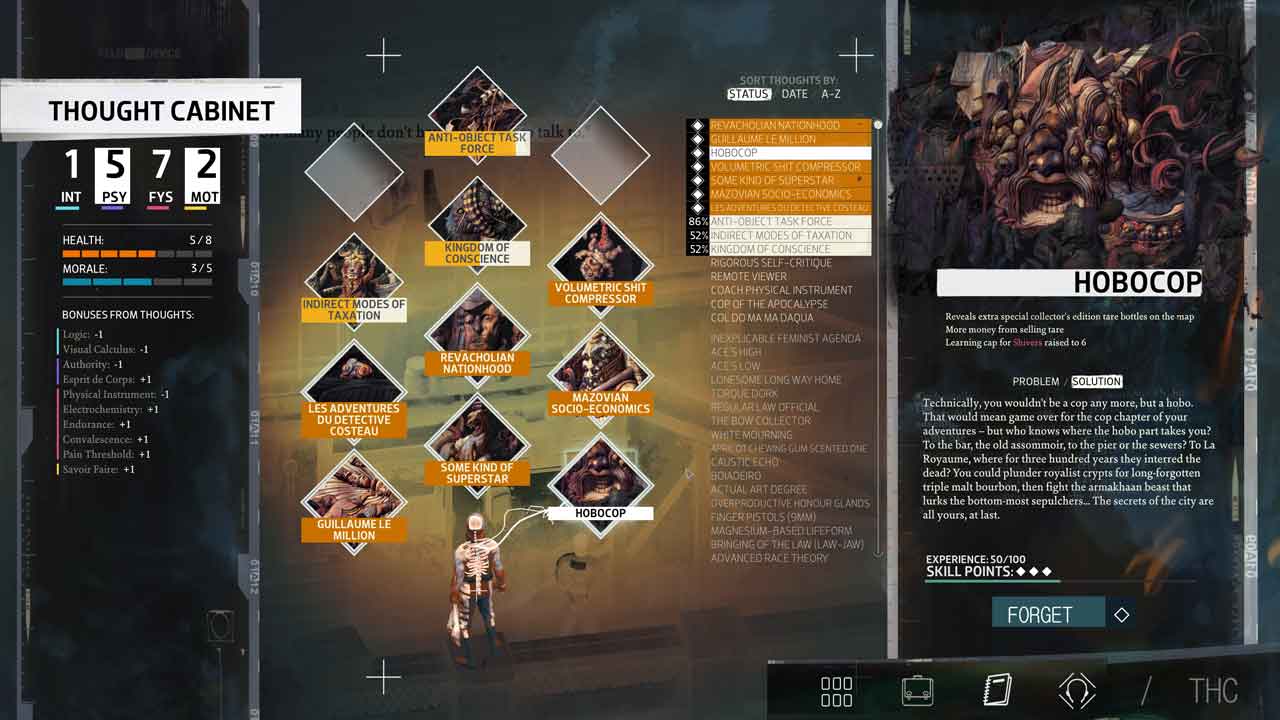 La personalizzazione non finisce qui. Mostra le tendenze comuniste nelle conversazioni e ad un certo punto i tuoi pensieri ti spezzeranno per spiegare che puoi sviluppare il comunismo. Oppure puoi maturare tendenze fasciste. O pensa come farebbe una vecchia discoteca. Questo meccanico si chiama Gabinetto del Pensiero; Hai una serie di slot per installare pensieri, svilupparli e sbloccare il loro risultato finale. È l'equivalente di vantaggi; ti offrono nuovi vantaggi e svantaggi, hai accesso a nuovi dialoghi o missioni secondarie …