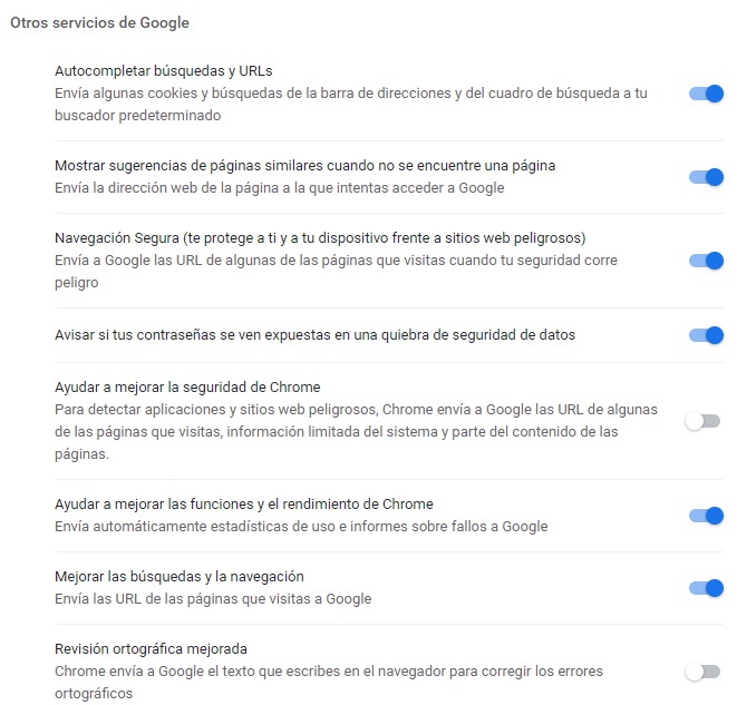 Detto questo, il resto non ha più importanza : se vogliamo aiutare a migliorare la sicurezza di Chrome attraverso i nostri URL; se vogliamo inviare segnalazioni di bug alla società in modo che le funzioni e le prestazioni del browser siano migliori; se vogliamo migliorare le ricerche e la navigazione e, infine, se vogliamo migliorare il controllo ortografico. Semplice.