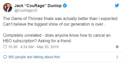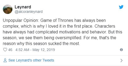 "Opinione impopolare: Game of Thrones è sempre stato complesso, e questo è ciò che mi ha attratto in primo luogo. I personaggi hanno sempre avuto motivazioni e comportamenti complicati. Ma in questa stagione li abbiamo visti troppo semplificati. Per me, questo è il motivo per cui questa stagione è stata la più colpita. "