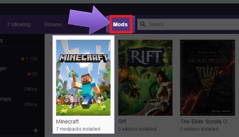 Una volta con Twitch sul dispositivo, apri l'app e accedi ad essa. Twitch rileverà automaticamente tutti i giochi installati sul dispositivo che sono compatibili con questa applicazione . Fai clic sul pulsante Mods e vedrai come appare Minecraft nell'elenco.