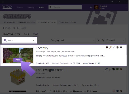 Individua la mod che desideri installare e fai clic sul pulsante viola "Installa" . In pochi istanti verrà scaricato sul tuo computer e puoi iniziare a giocare a Minecraft con le mod desiderate. È così semplice!